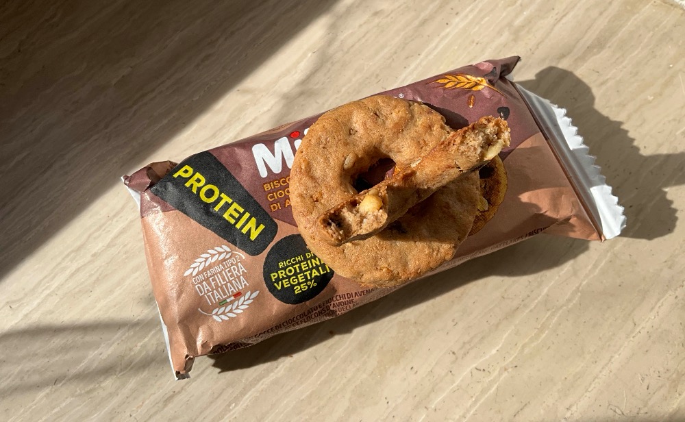 요즘 전 세계적으로 제로 슈가 제품과 프로틴 첨가 제품이 유행인 듯 하다. 그 흐름에 발 맞추어 MISURA에서도 프로틴 첨가를 강조한 제품이 새롭게 출시되었다. 식물성 프로틴 25% 첨가를 강조한 패키지 디자인이 눈에 확 들어온다. 큰 봉지에 4개씩 낱개 포장해서 6팩이 들어있다. 간식용으로 한 팩씩 가져다니기에 좋긴하나 개인적으론 한 봉지에 다 넣어서 포장비용만큼 가격을 내려주면 좋겠다.
