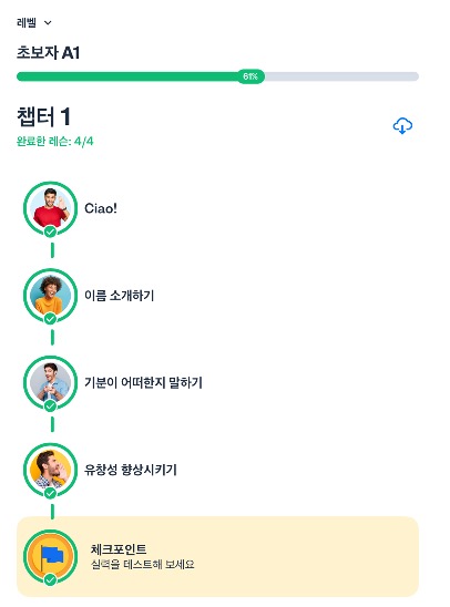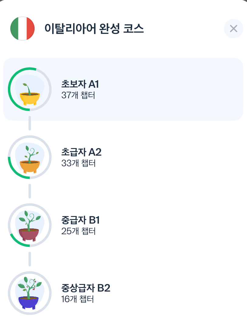 이탈리아어 학습 코스는 네 가지로 구성되어 있다. 이탈리아어 완성 코스를 중심으로 다른 코스를 함께 들으면 좋다. 이탈리아 완성 코스는 아래와 같이 4개의 챕터로 이루어져 있다. 초보자 A1을 들으면서 이탈리아어 발음을 듣고 따라 하길 바란다. 이후 초급자 A2를 공부하면서 이탈리아에서의 삶이나 여행용 이탈리아어를 함께 공부하면 좋다. 그 이유는 언어를 공부한다는 것은 문화도 함께 공부한다는 것이고 문화를 알면 그 언어에 대한 흥미와 관심이 더욱 높아지기 때문이다.