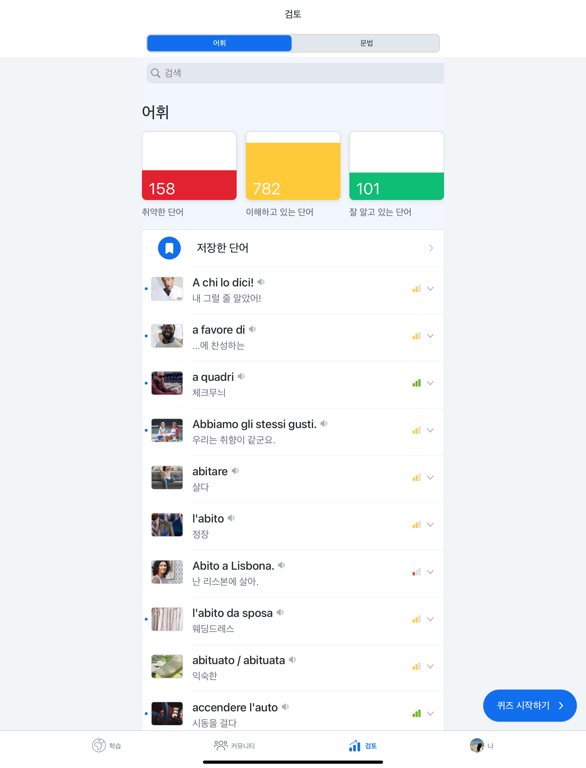 학습 후 검토에 들어가면 이제까지 배운 내용을 복습해 볼 수 있다. 퀴즈는 쓰기와 플래시카드로 선택이 가능하며 랜덤으로 나오기 때문에 복습 시 유용하다. 매일 조금씩 복습하여 뇌의 망각속도를 늦추어 보자!