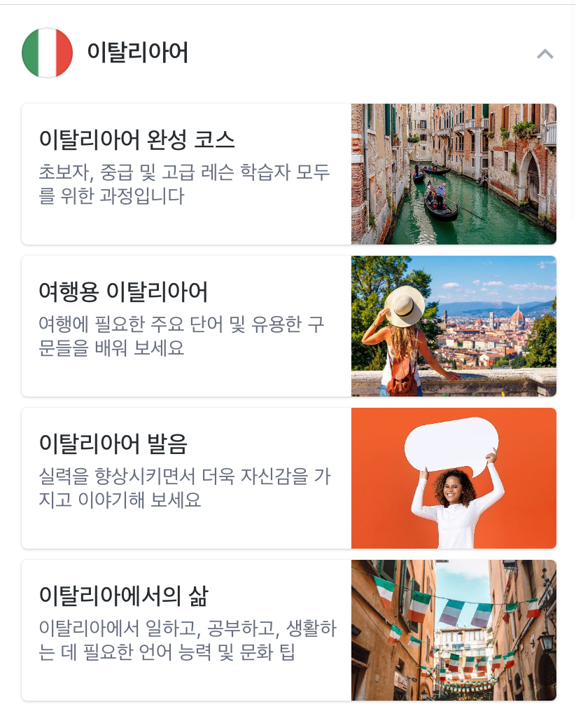 요즘은 어학 앱이 AI 기술을 도입하여 성능이 많이 향상된 것을 느낀다. 몇 해 전 이탈리아어를 공부하기 위해 유로로 사용했던 어학앱 BUSUU에 대해 소개하고 개인적으로 느낀 점을 포스팅하고자 한다. 이탈리아어뿐만 아니라 영어, 일본어, 중국어와 그 외 유럽국가 언어인 프랑스어, 스페인어, 포르투갈어 등이 있고 심지어 아랍어도 있다. 가장 잘 구성되어 있는 언어는 역시 영어다. 영어는 AI와 간단한 대화를 주고받을 수 있는 기능까지 잘 갖추어져 있다. 영어가 전 세계 통용어이니 만큼 많은 투자가 되고 있다는 사실이 다른 언어 학습자 입장에서는 아쉽기만 하다. 차츰 나아질 것이라 믿고 이탈리아어 학습 코스에 대해 둘러보자.