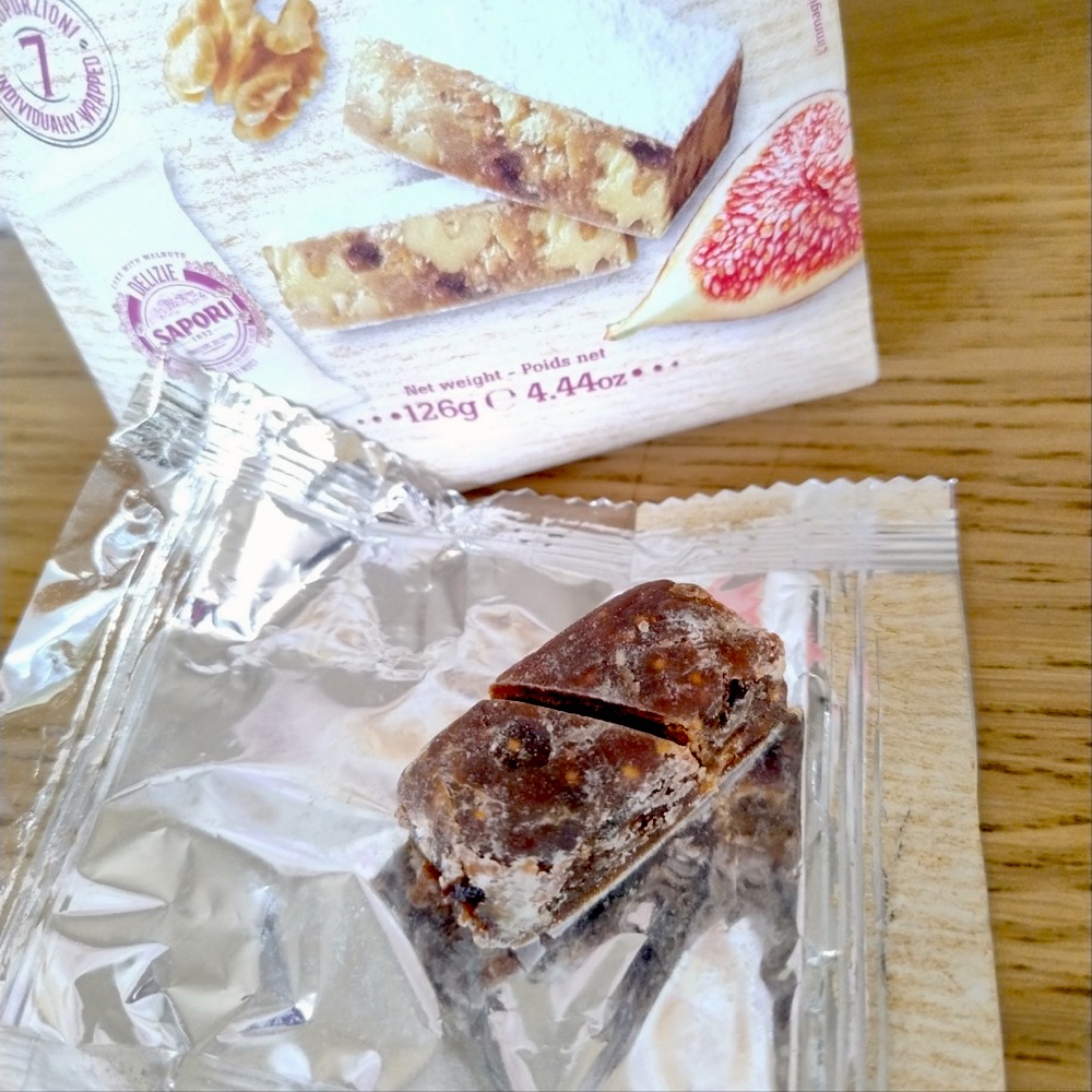 panforte fichi e noci는 ’ 무화과와 호두가 들어간 단단한 빵‘이라는 뜻입니다. 제가 구매한 제품은 낱개로 개별 포장된 제품이지만 사실 납작한 원형 모양에 종이 포장으로 된 제품이 일반적입니다. 판포르테는 일종의 과일 케이크입니다. 건조 무화과, 호두, 아몬드, 꿀, 향신료 등이 어우러져 독특한 풍미를 자랑하는 것이 특징입니다. 이탈리아 중부 지방에서 유명한 전통 디저트로 특히 토스카나와 시에나에서 더욱 유명합니다.